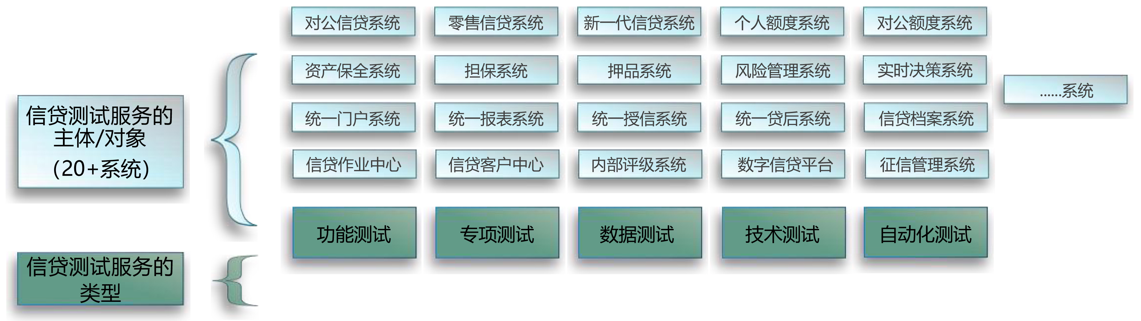 提供全面的测试服务,涵盖新信贷、对公/零售信贷等20+信贷类系统,以及功能、性能、数据、自动化等类型测试。
